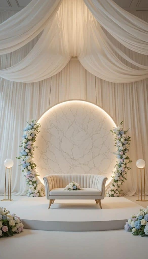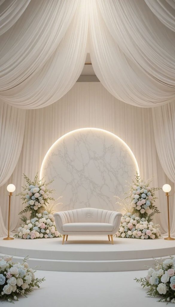 Elegant engagement stage with floral décor –Melka Kosha and Khutubah setup. كوشة ملكة وخطوبة أنيقة مزينة بالورود.